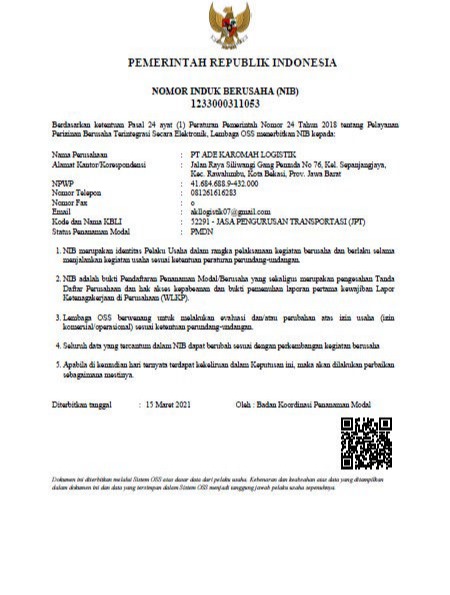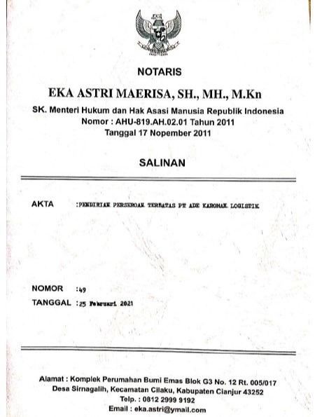 Pada tahun 2021 didirikan PT.ADE KAROMAH LOGISTIK, Perusahaan ini bergerak di bidang jasa